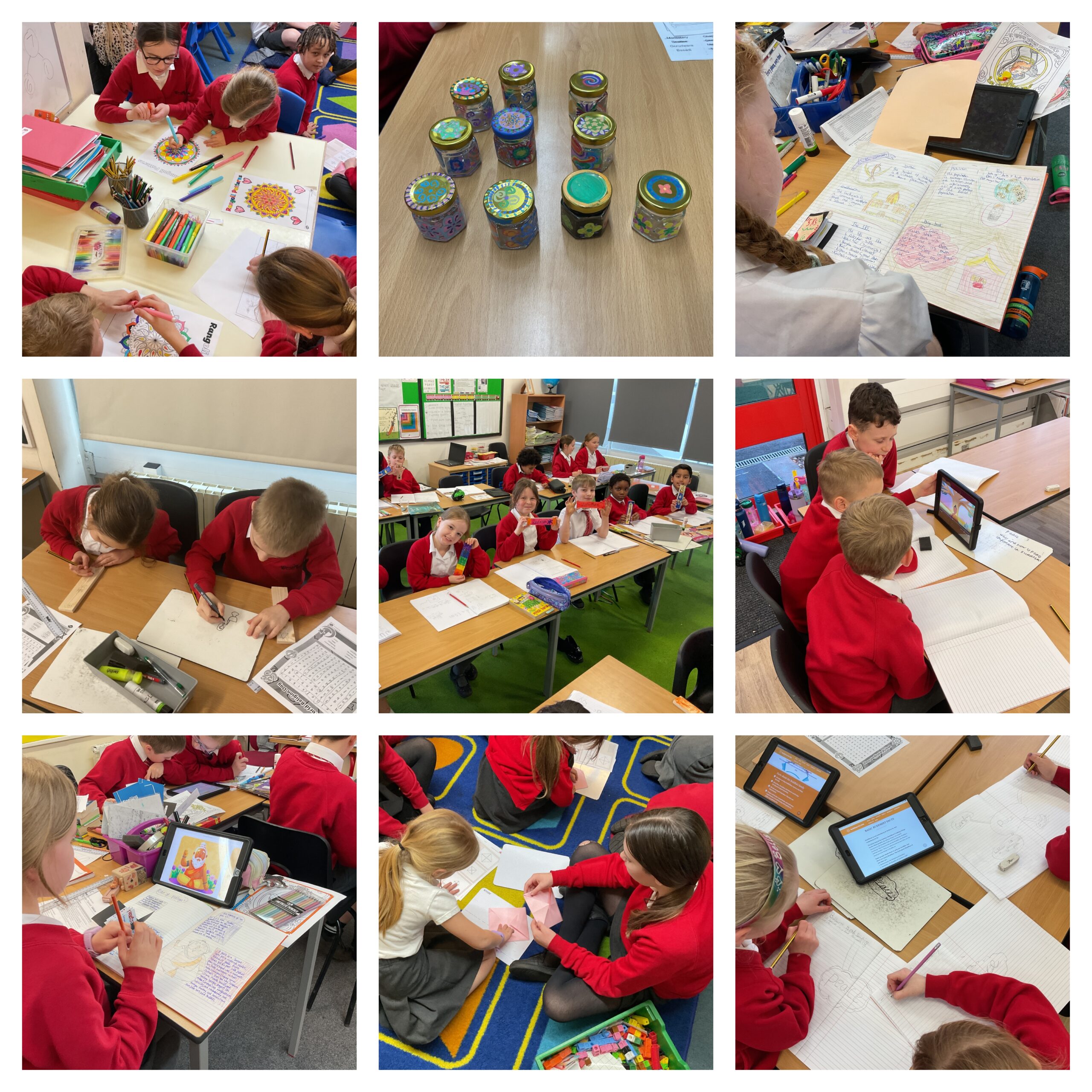 Back in their classrooms, each year group explored their given religion by learning about the origins of the religion as well as their key beliefs, holy texts and places of worship (including virtual tours!) Following this inquiry and investigation, pupils presented their understanding through a variety of creative activities including creating their own prayer flags and glass paintings. In the afternoon all of the children spent time pondering their religion and completing related activities researched a topic of their choosing, linked to the religion they had learnt about in the morning and displayed their findings in double page spreads. A particular highlight for Year 6 was visiting our Year 2 classes at WIS to create Rangoli patterns and origami lotus flowers. Overall, this day of celebration created an atmosphere of respect and