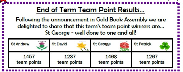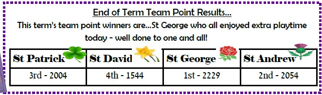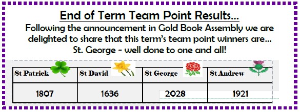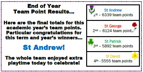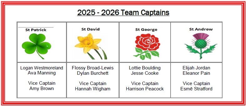 Children at Westfields are split into four different teams represented by colours and named after the patron saints of the United Kingdom; red for St George, yellow for St David, green for St Patrick and blue for St Andrew. These are integral to the school, being used to reward good behaviour and learning.